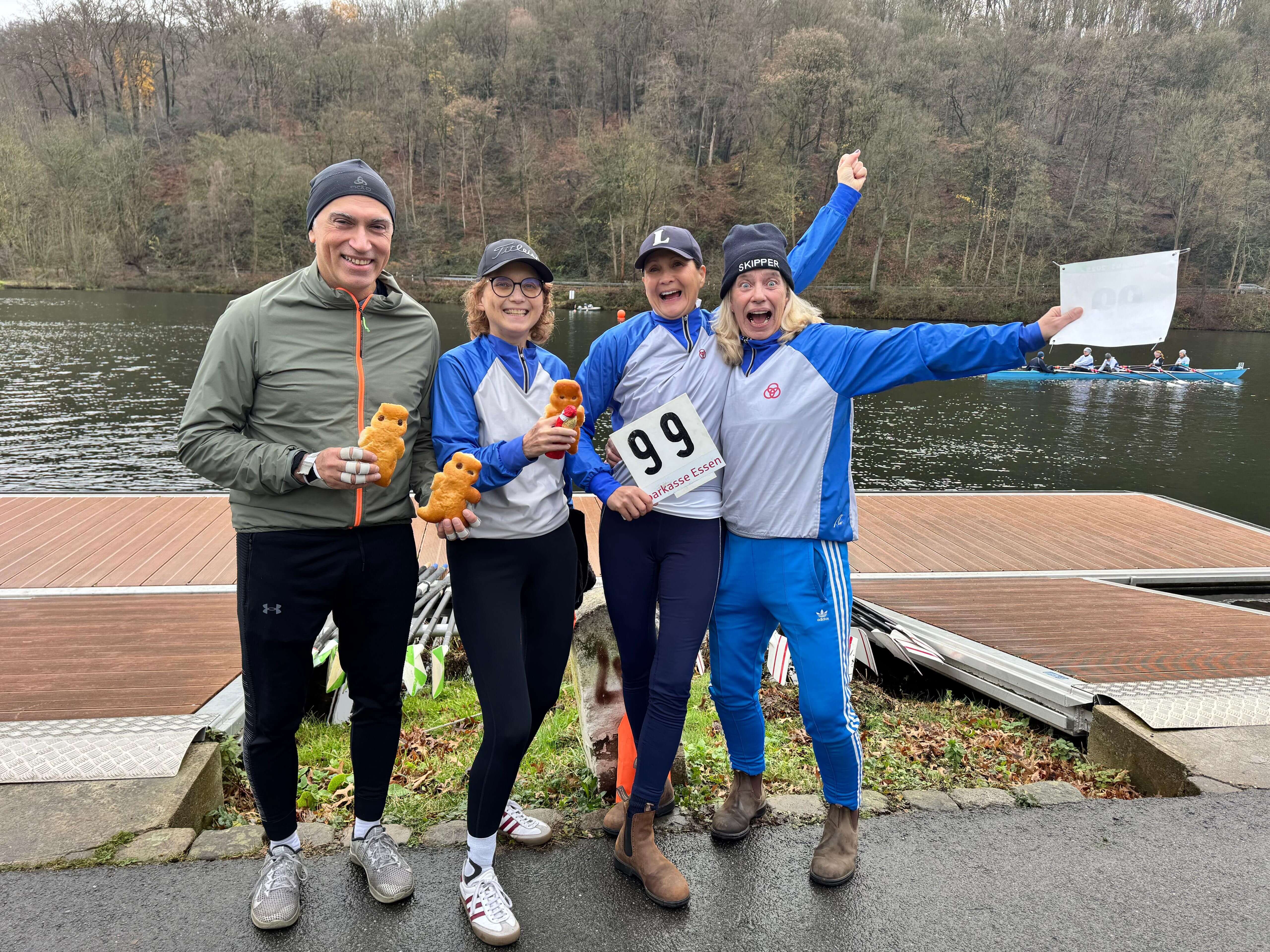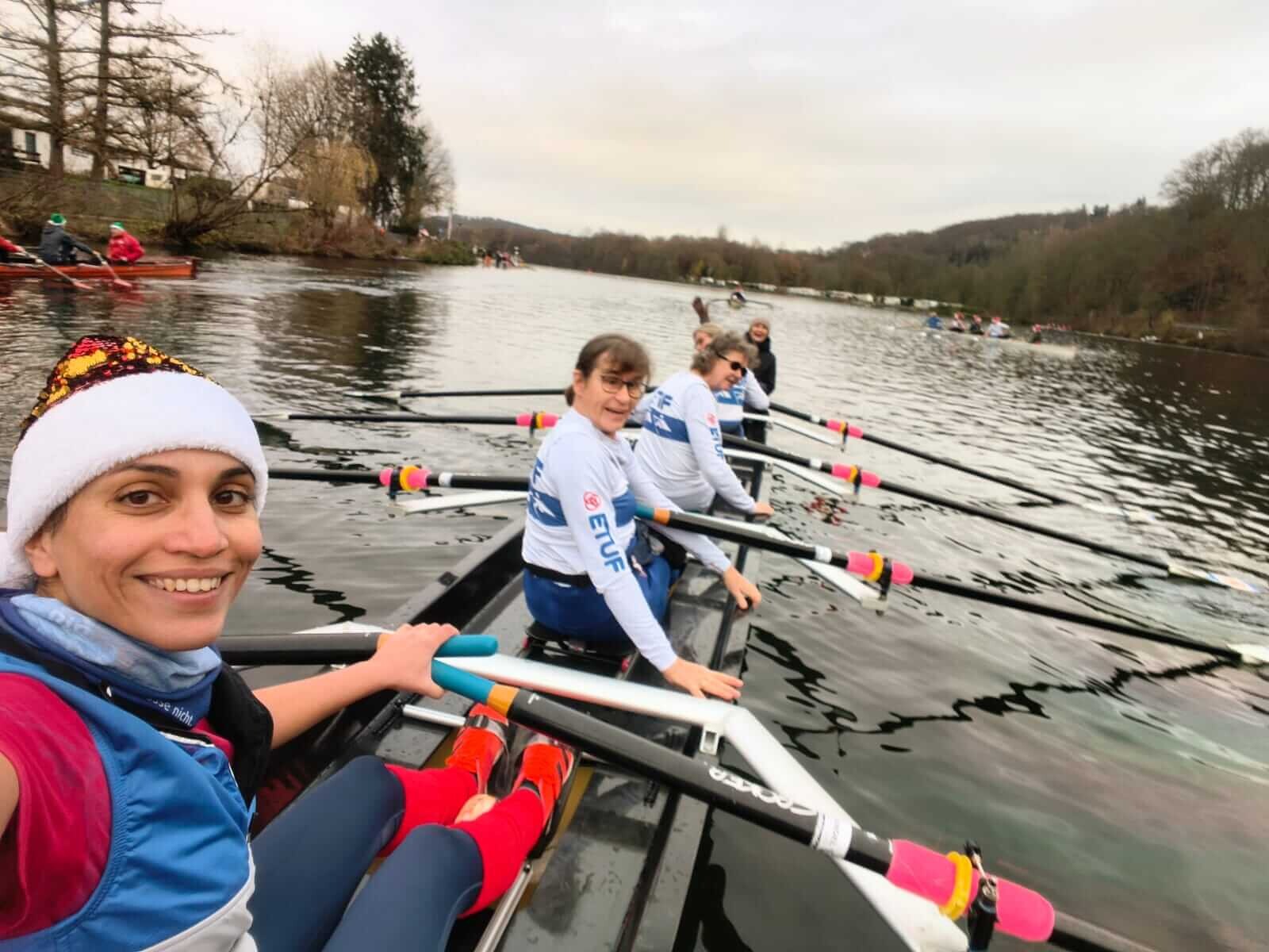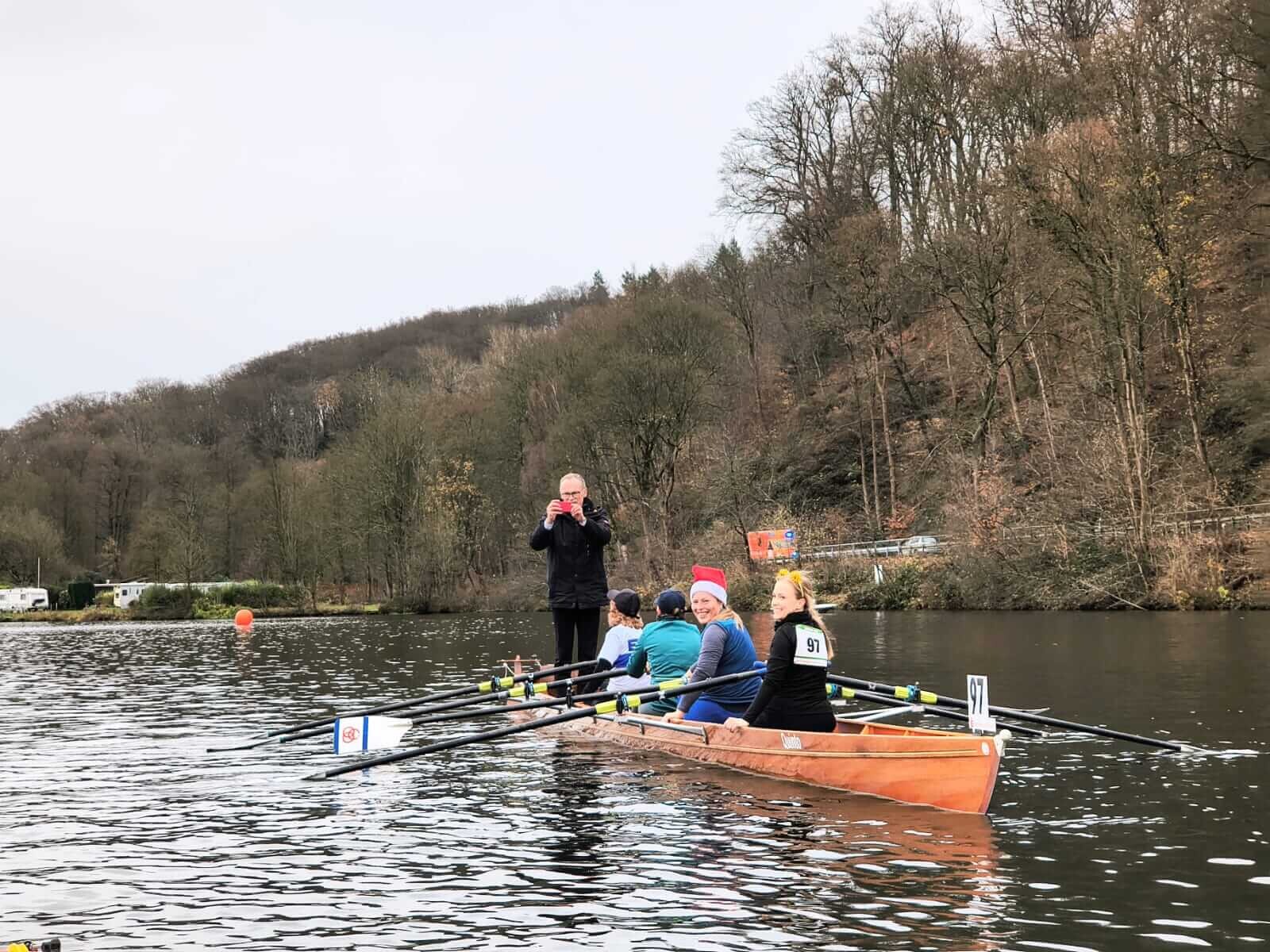 In den letzten zwei Jahren war die Nikolausregatta wegen Hochwassers ausgefallen. Am 7. Dezember war es endlich wieder so weit, dass die beliebte Regatta stattfinden konnte, und das bei milden Temperaturen und ohne Wind ohne Regen. Rund 700 Teilnehmer gingen auf die vier Kilometer lange Strecke auf der Ruhr von Kettwig in Richtung Werden und wieder zurück. Die Ruderriege ETUF hatte gleich sieben Vierer und zwei Ruderer in einem Renngemeinschaftsachter gemeldet, davon vier Anfänger-Vierer mit Ruderinnen und Ruderern, die in den letzten zwei Jahren in den Anfängerkursen oder als Teilnehmer von "Rudern gegen Krebs" das Rudern gelernt haben. Das Ergebnis war perfekt. Alle vier Mannschaften konnten sich am Ende die begehrten Medaillen umhängen lassen. Zum Teil war das nicht ganz so schwer, weil keine Gegner in den entsprechenden Altersklassen gemeldet hatten. Als dann bei der Siegerehrung viermal hintereinander der ETUF aufgerufen wurde, gab es ein großes Lob für die offensichtlich hervorragende Ausbildungsarbeit. Für die Ausbilder und Organisatoren war es eine verdiente Anerkennung für viele Stunden Arbeit. Die erfahreneren Mannschaften mussten sich mit deutlich härterer Konkurrenz auseinandersetzen. In vielen Rennen lagen Renngemeinschaften aus ehemaligen Leistungsruderern ganz vorne. Das tat der guten Stimmung aber keinen Abbruch. Mit Weckmmännern für alle Teilnehmer, Glühwein und Würstchen vom Grill war es ein rundum gelungener Regattatag, der besonders unsere Neuen motiviert hat, in der kommenden Saison weiterzumachen.