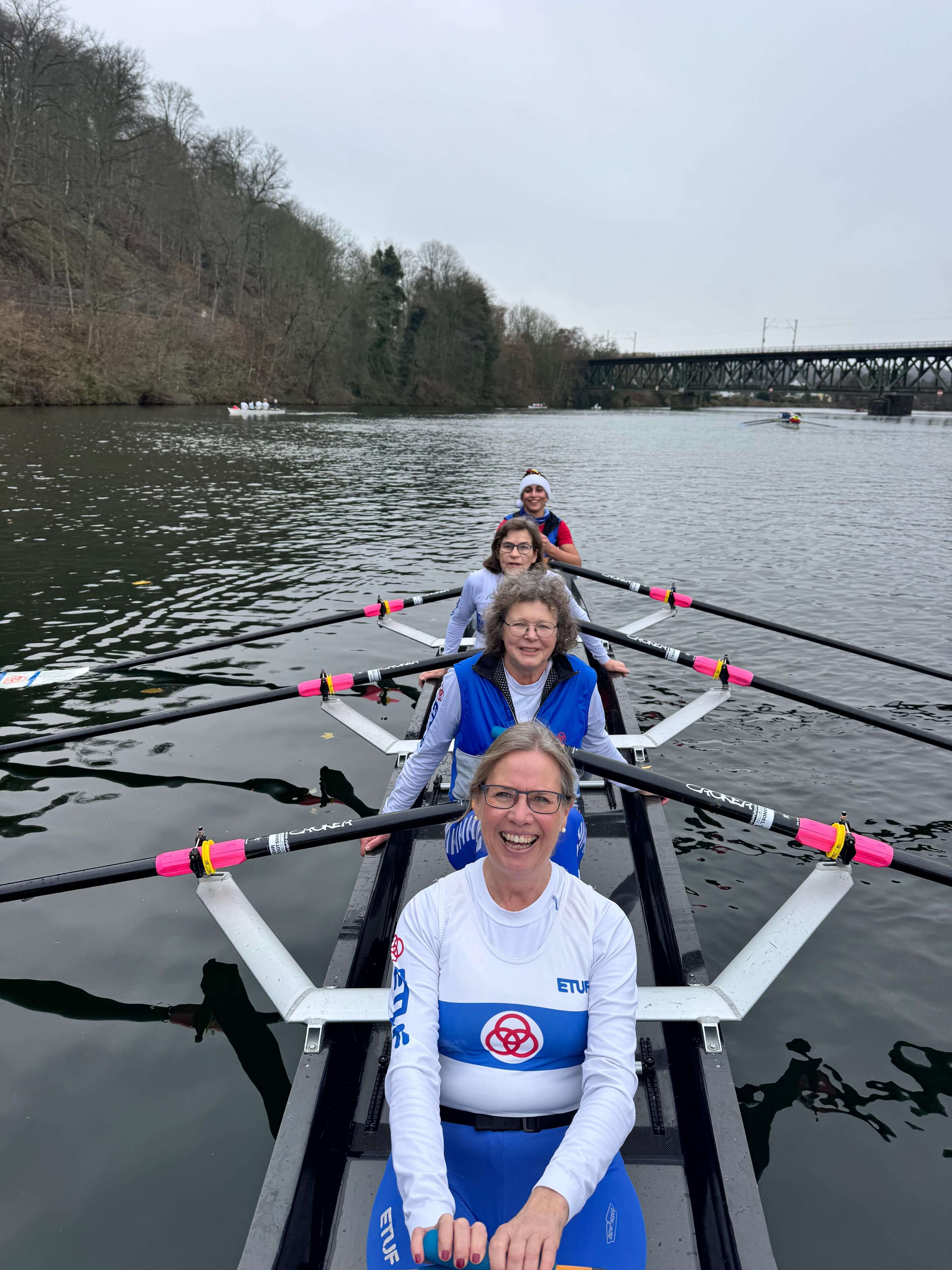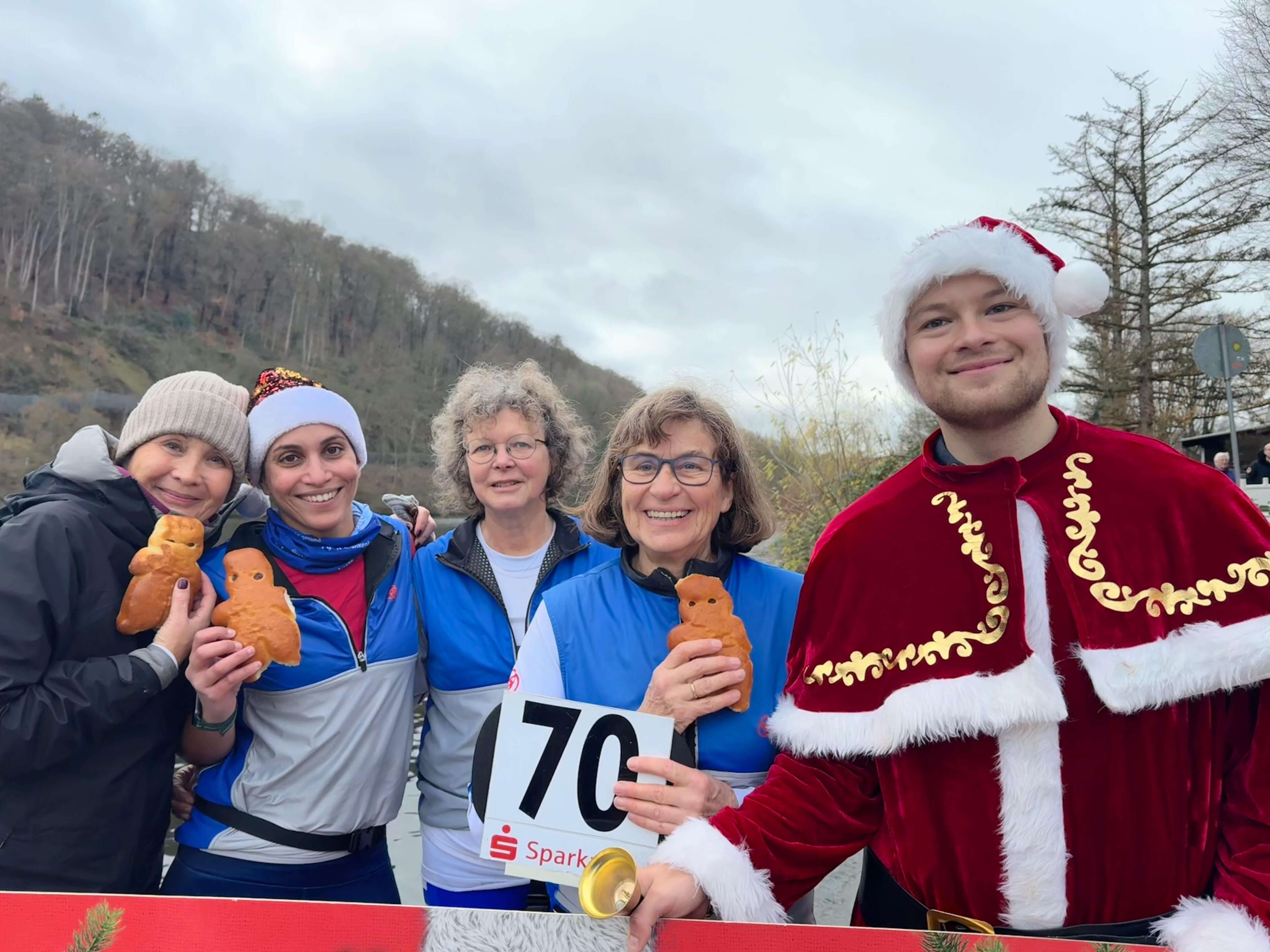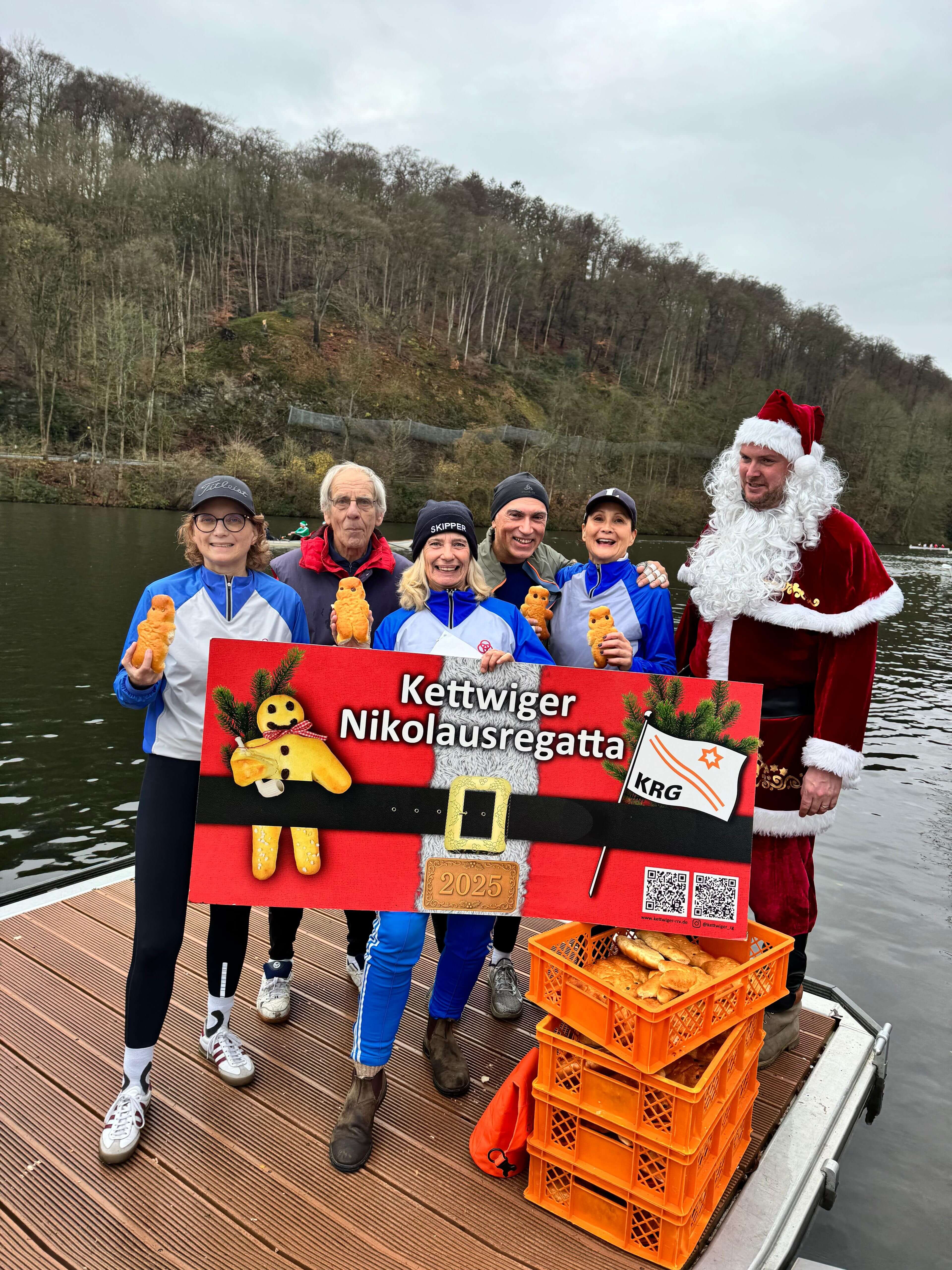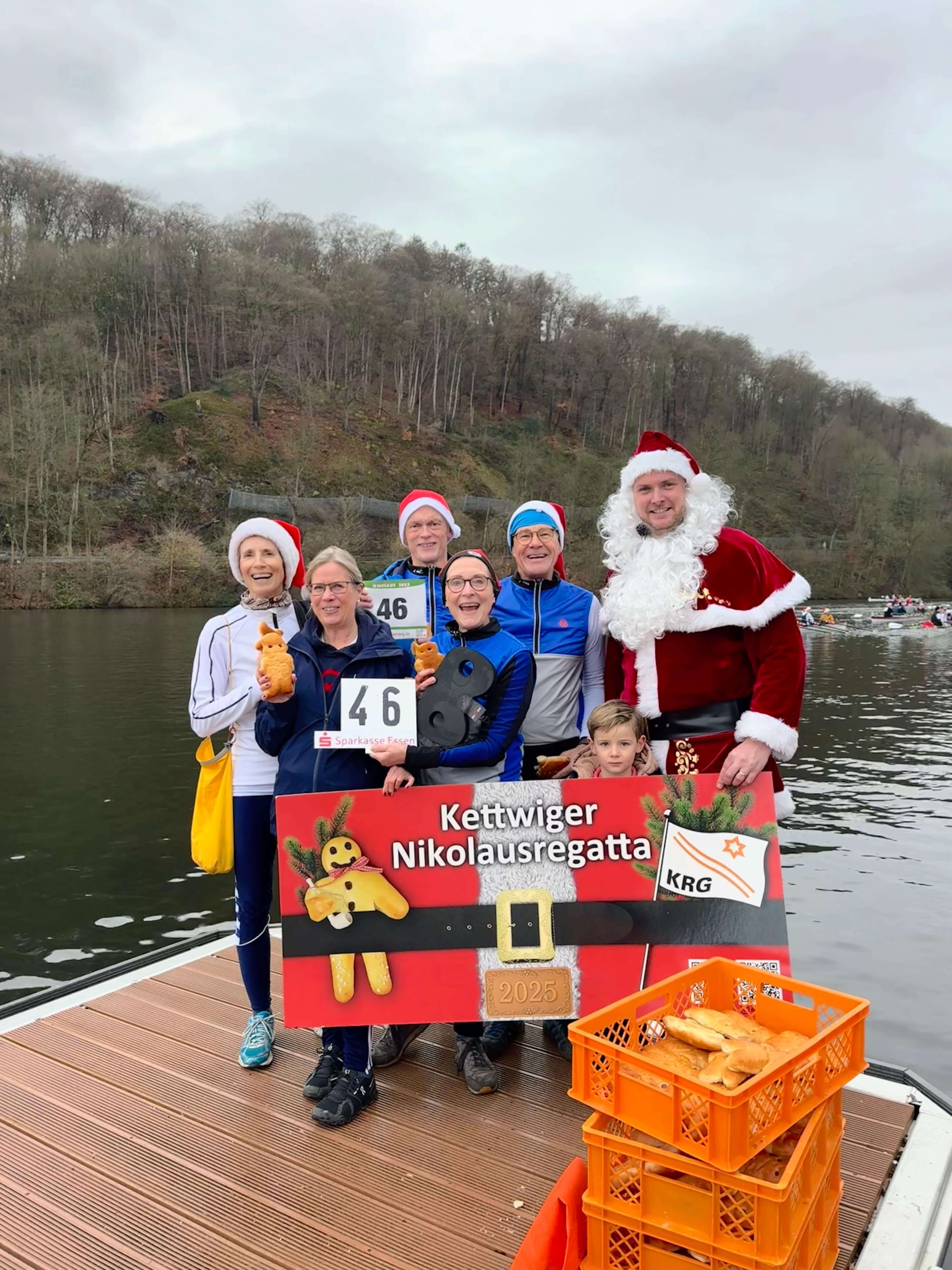 In den letzten zwei Jahren war die Nikolausregatta wegen Hochwassers ausgefallen. Am 7. Dezember war es endlich wieder so weit, dass die beliebte Regatta stattfinden konnte, und das bei milden Temperaturen und ohne Wind ohne Regen. Rund 700 Teilnehmer gingen auf die vier Kilometer lange Strecke auf der Ruhr von Kettwig in Richtung Werden und wieder zurück. Die Ruderriege ETUF hatte gleich sieben Vierer und zwei Ruderer in einem Renngemeinschaftsachter gemeldet, davon vier Anfänger-Vierer mit Ruderinnen und Ruderern, die in den letzten zwei Jahren in den Anfängerkursen oder als Teilnehmer von "Rudern gegen Krebs" das Rudern gelernt haben. Das Ergebnis war perfekt. Alle vier Mannschaften konnten sich am Ende die begehrten Medaillen umhängen lassen. Zum Teil war das nicht ganz so schwer, weil keine Gegner in den entsprechenden Altersklassen gemeldet hatten. Als dann bei der Siegerehrung viermal hintereinander der ETUF aufgerufen wurde, gab es ein großes Lob für die offensichtlich hervorragende Ausbildungsarbeit. Für die Ausbilder und Organisatoren war es eine verdiente Anerkennung für viele Stunden Arbeit. Die erfahreneren Mannschaften mussten sich mit deutlich härterer Konkurrenz auseinandersetzen. In vielen Rennen lagen Renngemeinschaften aus ehemaligen Leistungsruderern ganz vorne. Das tat der guten Stimmung aber keinen Abbruch. Mit Weckmmännern für alle Teilnehmer, Glühwein und Würstchen vom Grill war es ein rundum gelungener Regattatag, der besonders unsere Neuen motiviert hat, in der kommenden Saison weiterzumachen.