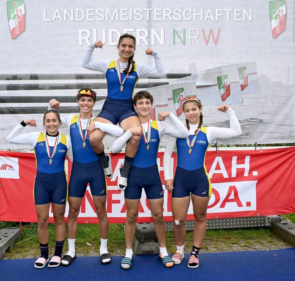 Im Herbst gab es für die ETUF-Ruderinnen und -Ruderer noch zwei Höhepunkte, die NRW-Landesmeisterschaft, die dieses Jahr am 5. Oktober in Krefeld stattfand, und die deutsche Sprintmeisterschaft vom 10. bis 12. Oktober in Wiesbaden. In Krefeld traten alle Altersklassen einschließlich der Jungen und Mädchen über eine Strecke von 1000 Metern an. Carla Högner ruderte bei den 14jährigen Mädchen auf einen hervorragenden zweiten Platz. Max Zimmer kam bei den 14jährigen Leichtgewichten auf den vierten Platz im B-Finale. Vierte Plätze gab es für Malou Schmidt im Frauen-Einer und für Antonia Mohnfeld und Paulina Gardlo im ungesteuerten Frauen-Zweier. Ein ganzes Bündel Medaillen holte sich Beta van Emmerich. Bei den fünfzehn- und sechzehnjährigen Juniorinnen gewann sie Silber im Einer und dann gleich dreimal Gold im Doppelzweier, im Doppelvierer und im Mix-Vierer.