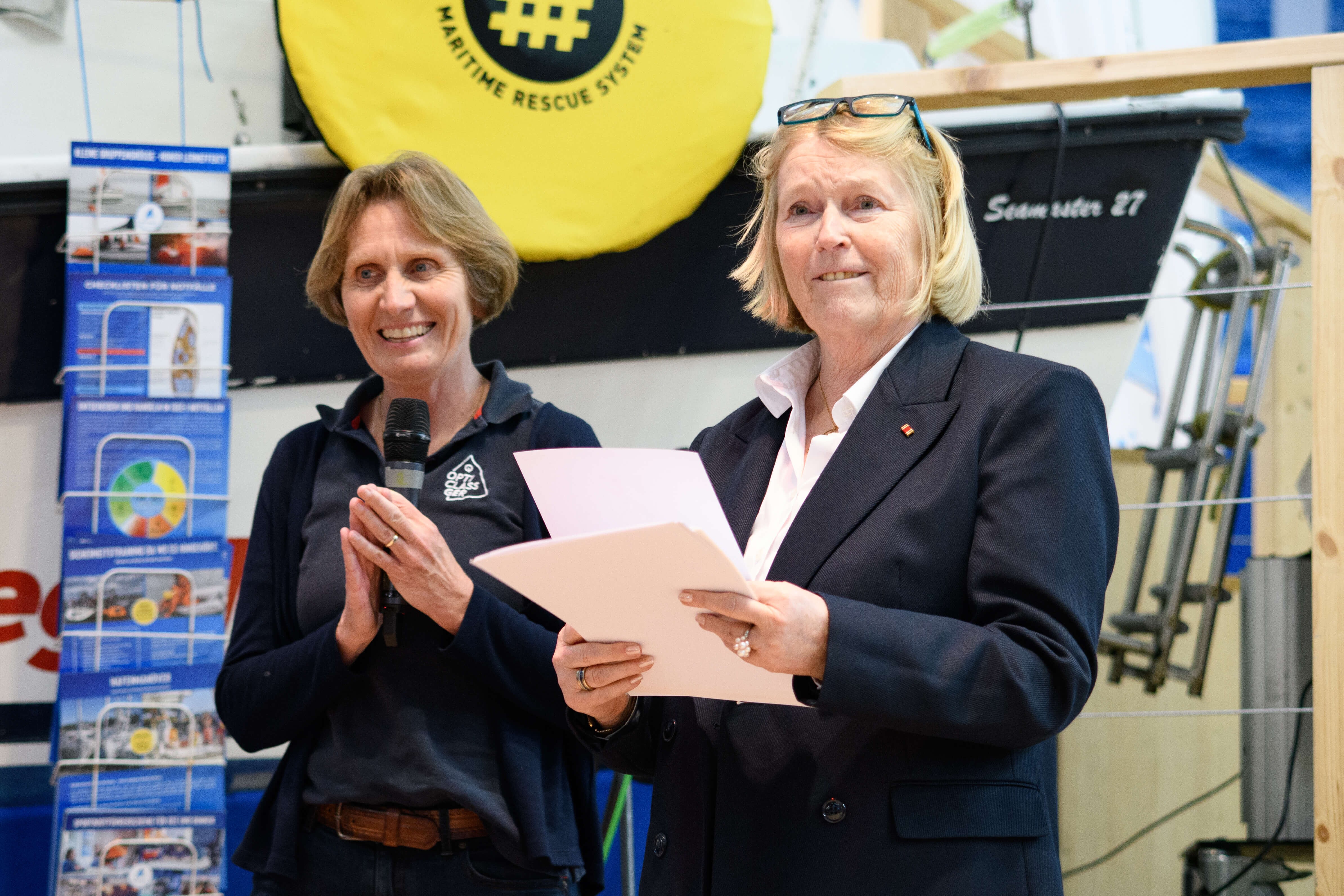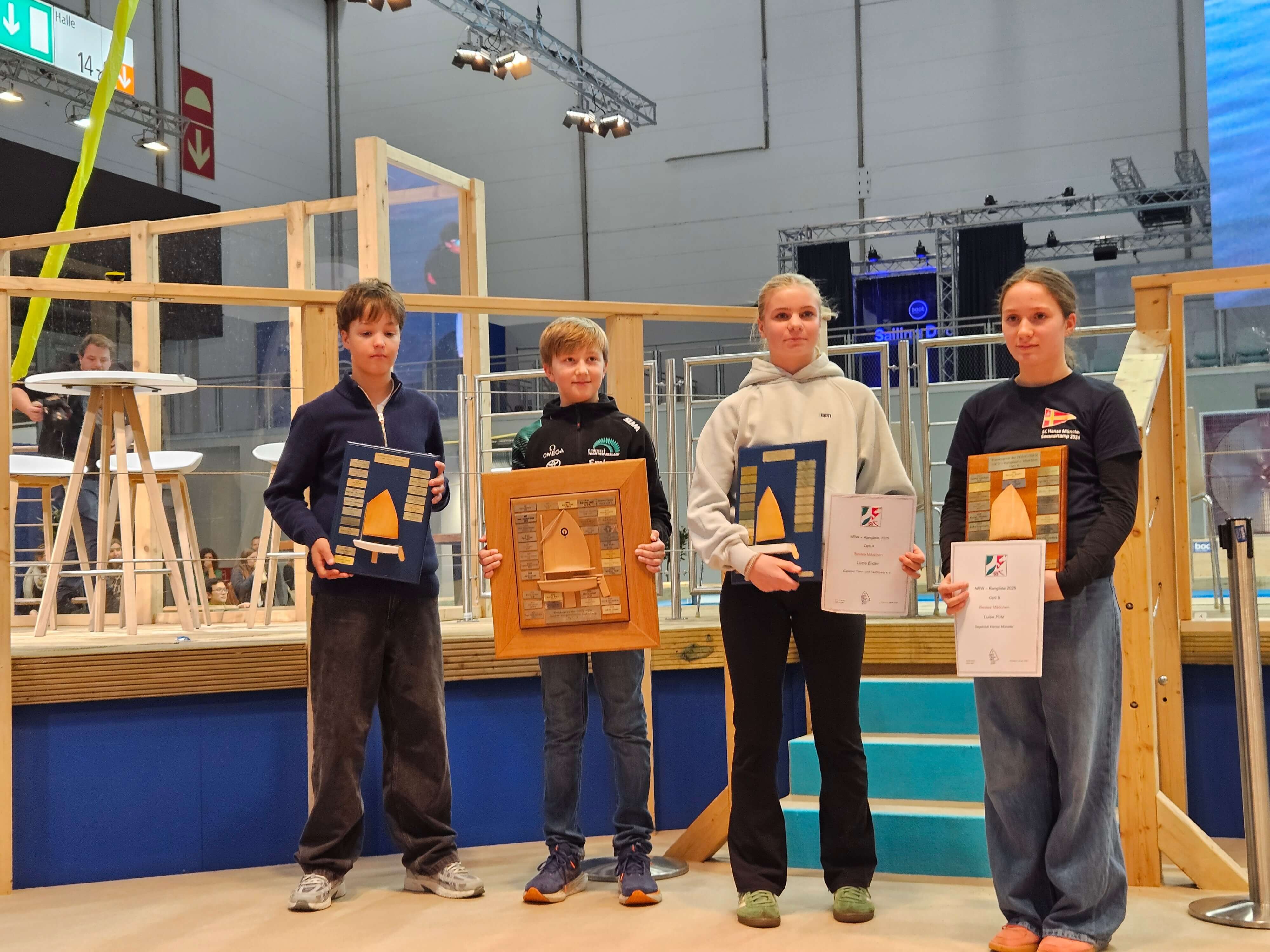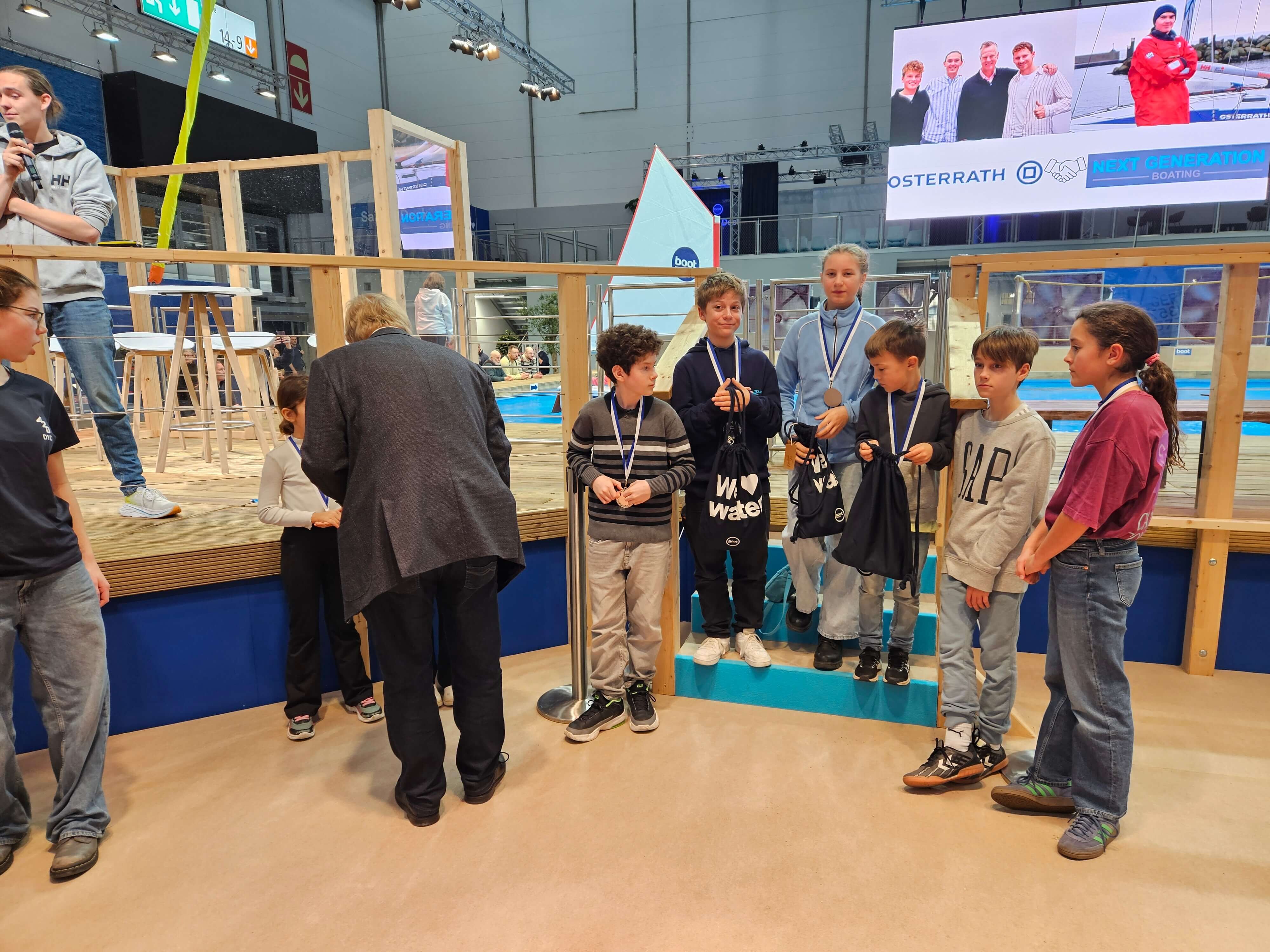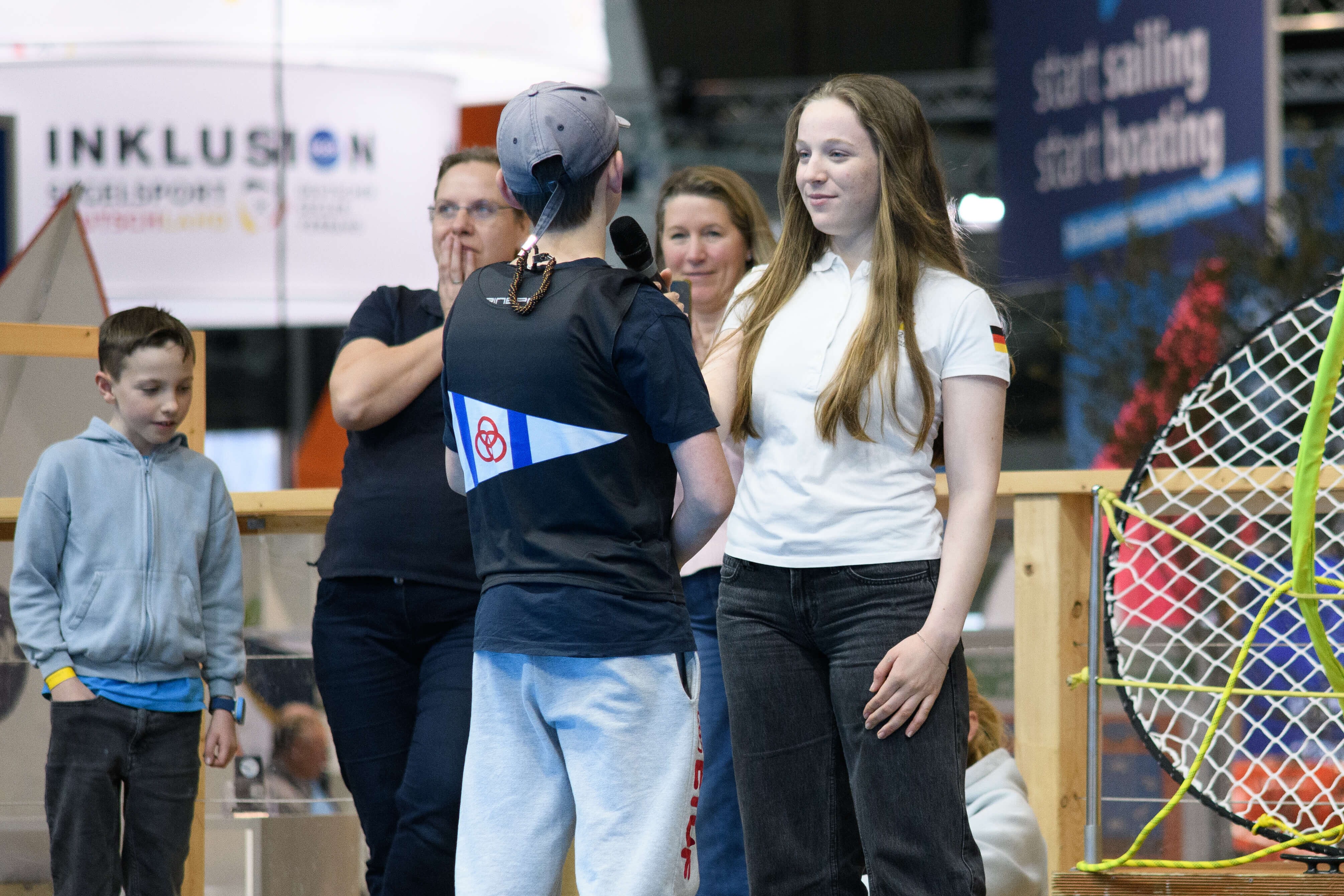 Das Highlight des Tages kam dann am Nachmittag. Es begann mit der Ehrung der jeweils 10 besten NRW Optisegler in Opti A und Opti B des Regattajahres 2025. Kein geringerer als Mona Küppers, Präsidentin des DSV, überreichte den besten „Jüngsten“ die traditionelle Müslischale und eine Urkunde als Auszeichnung für ihre Leistungen des vergangenen Jahres. Vom ETUF waren vier Segler unter den Geehrten: Lars Rohde (Opti A, Platz 2), Luzia Ender (Opti A, Platz 6 und bestes Mädchen), Henriette Pfeiffer (Opti A, Platz 10) und Frederik Koska (Opti B, Platz 6).