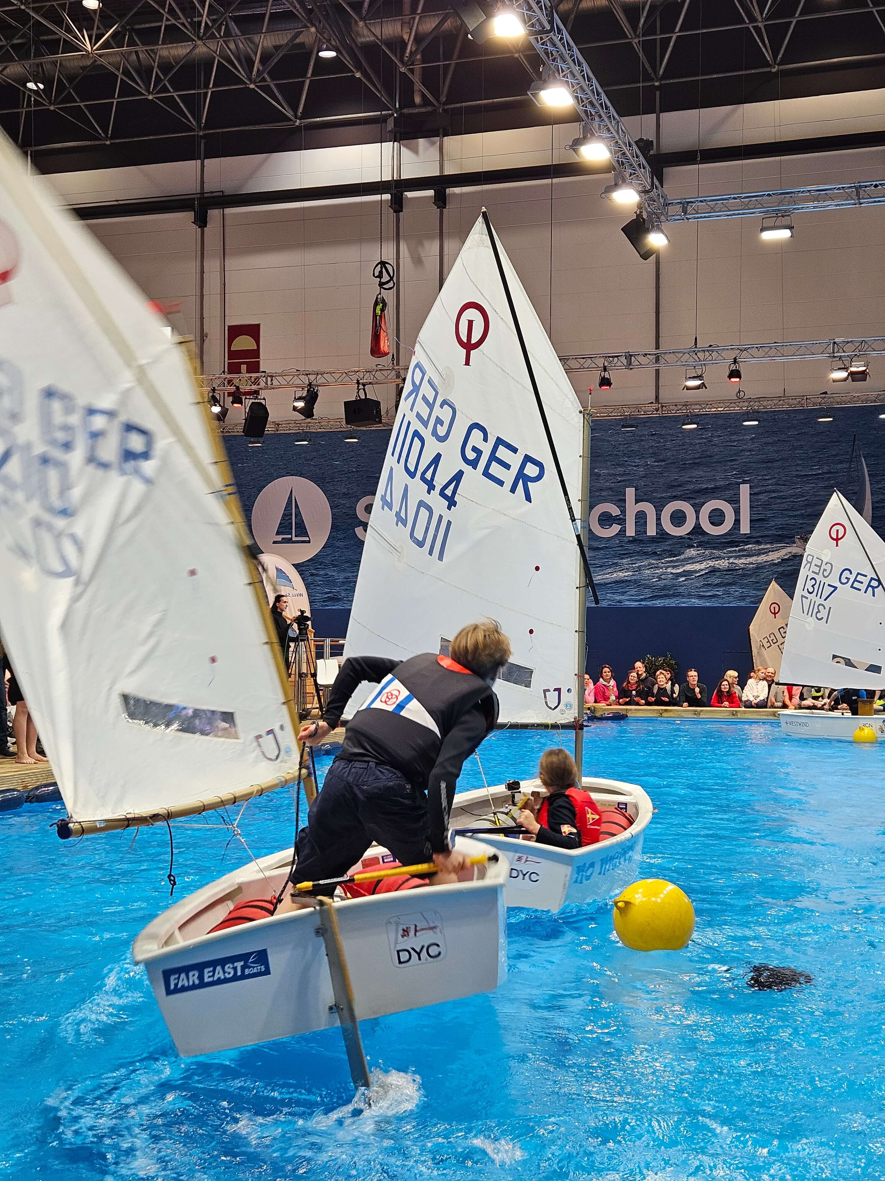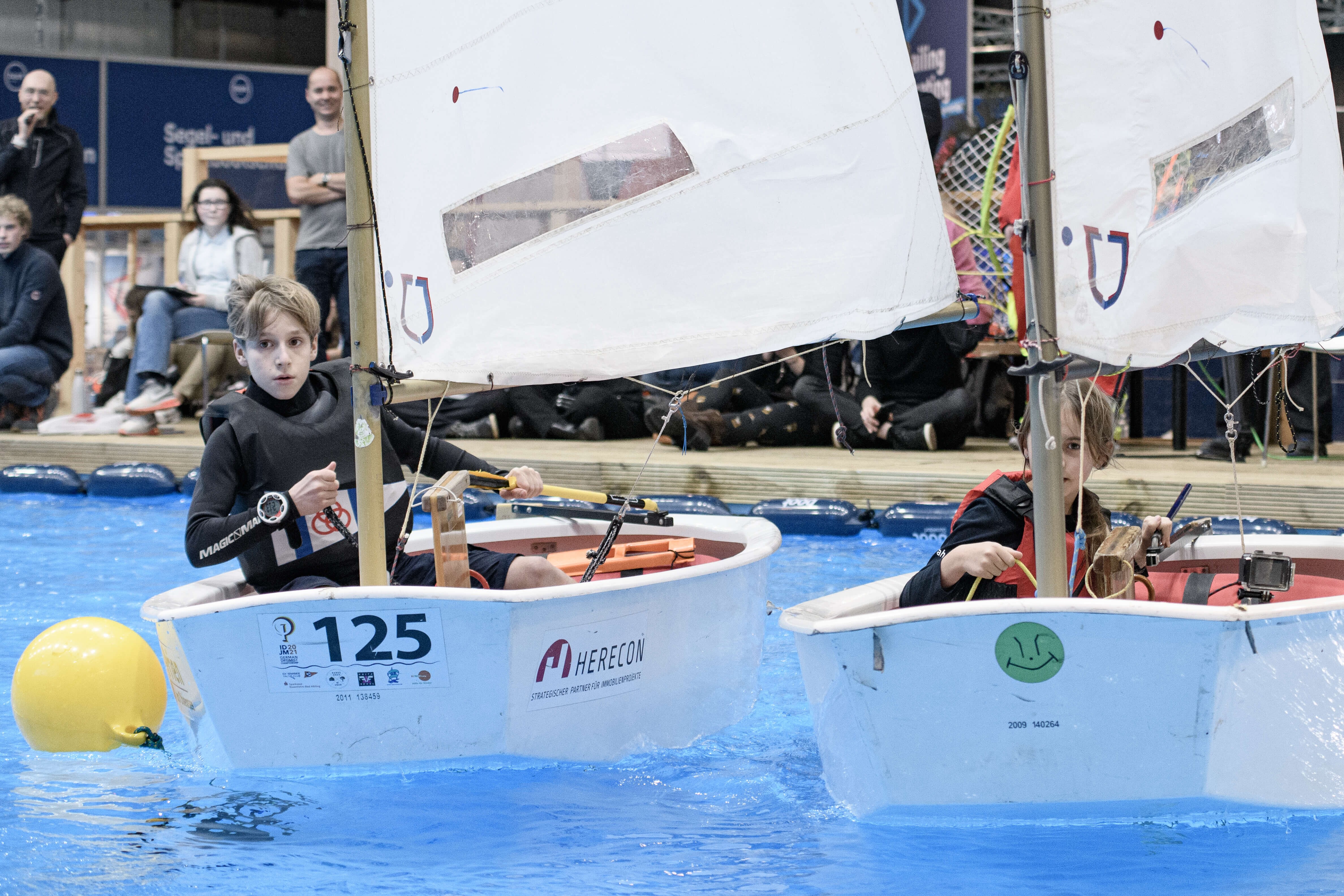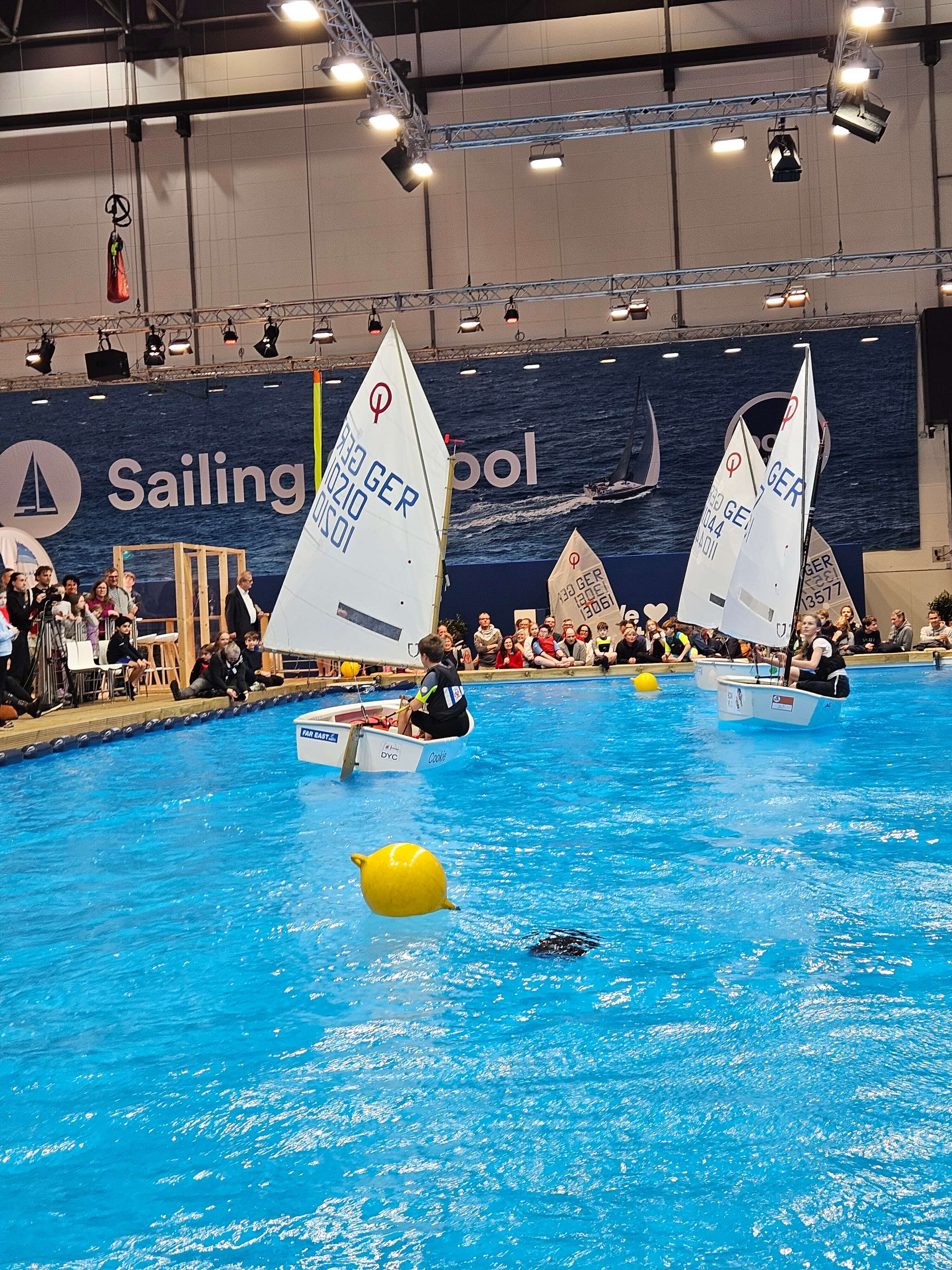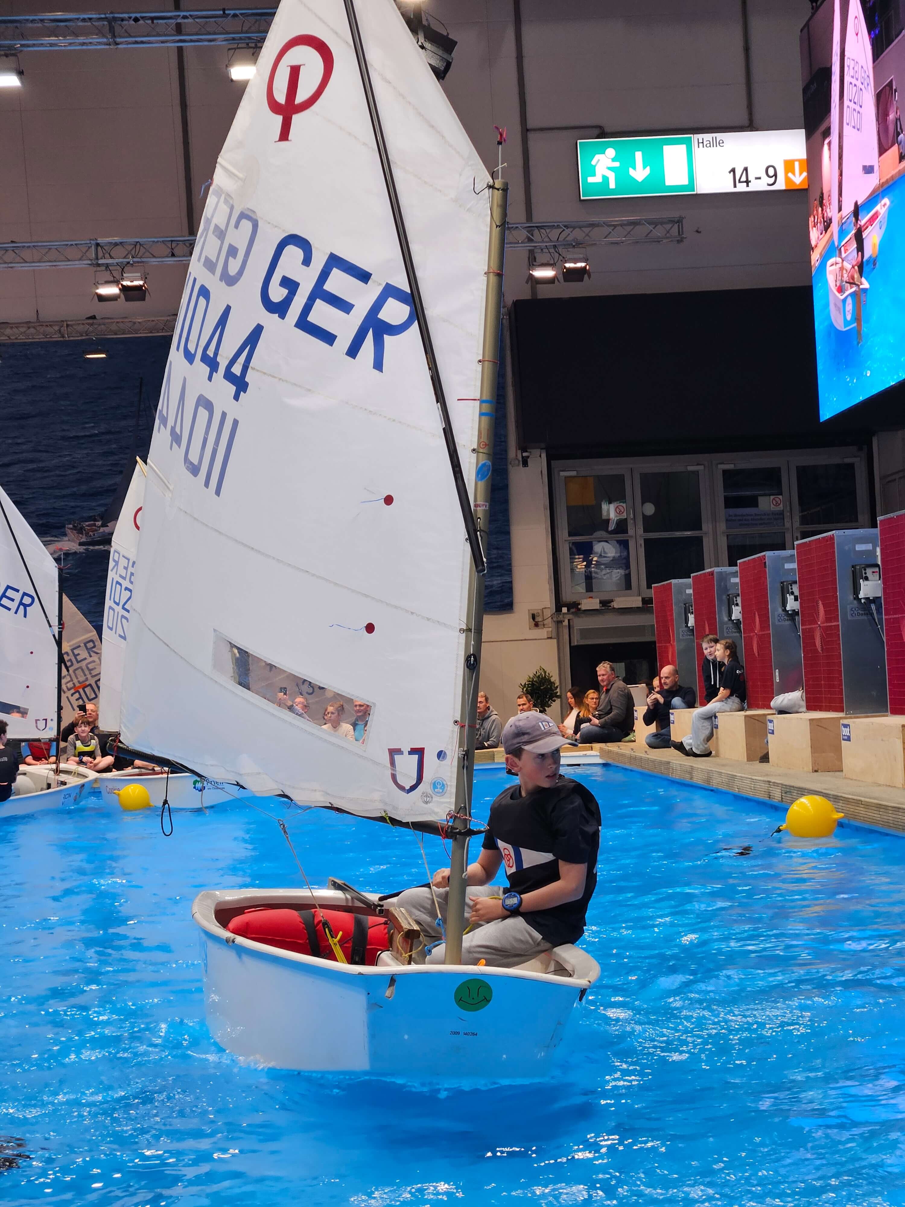 Danach wurde es besonders spannend: der Messecup, die einzige indoor Regatta Deutschlands, stand an. Hierbei treten Teams aus jeweils drei Seglern gegeneinander an, gesegelt wird in einer Qualifikations- und einer Finalserie. Wir hatten – wie einige andere Clubs auch – zwei Teams dabei: Team ETUF 1 mit Lars Rohde, Hendrik Müller und Henriette Pfeiffer und Team ETUF 2 mit Frederik Koska, Rosa Bargatzki und Johannes Gäch vom SC Ville, der für eine ausgefallene Seglerin kurzfristig eingesprungen war. Zwar ist das Becken auf der Messe nicht so groß wie ein See und der Wind kommt aus dem Ventilator, aber gerade das macht es auch besonders knifflig. Der Start ist besonders entscheidend, da es nur wenige Möglichkeiten gibt, andere Segler zu überholen. Und so zeigten unsere Segler, was sie gelernt hatten: brilliante Startmanöver und auch die Fähigkeit, ihre erkämpften Plätze an der Linie zu verteidigen. Die Rennen waren sehr spannend und letztendlich hatten es nach einer souveränen Leistung beide ETUF Teams in das Finale geschafft. Die Spannung blieb hoch: Vor dem letzten Rennen des Tages stand es auf Gleichstand zwischen dem Team ETUF 1 und dem Team vom SKBUe, alles kam nun auf diesen letzten Lauf an. Die anderen Optikinder gaben vom Rand des Beckens aus alles und feuerten unsere Teams lautstark an. Und es hat geklappt: unsere Seglerin behielt die Nerven und brachte den Sieg souverän zum ETUF. Somit war das Endergebnis Platz 1 für Team ETUF 1, Platz 2 für den SKBUe und Platz 3 für Team ETUF 2. Eine tolle Leistung von Euch allen, herzlichen Glückwunsch!