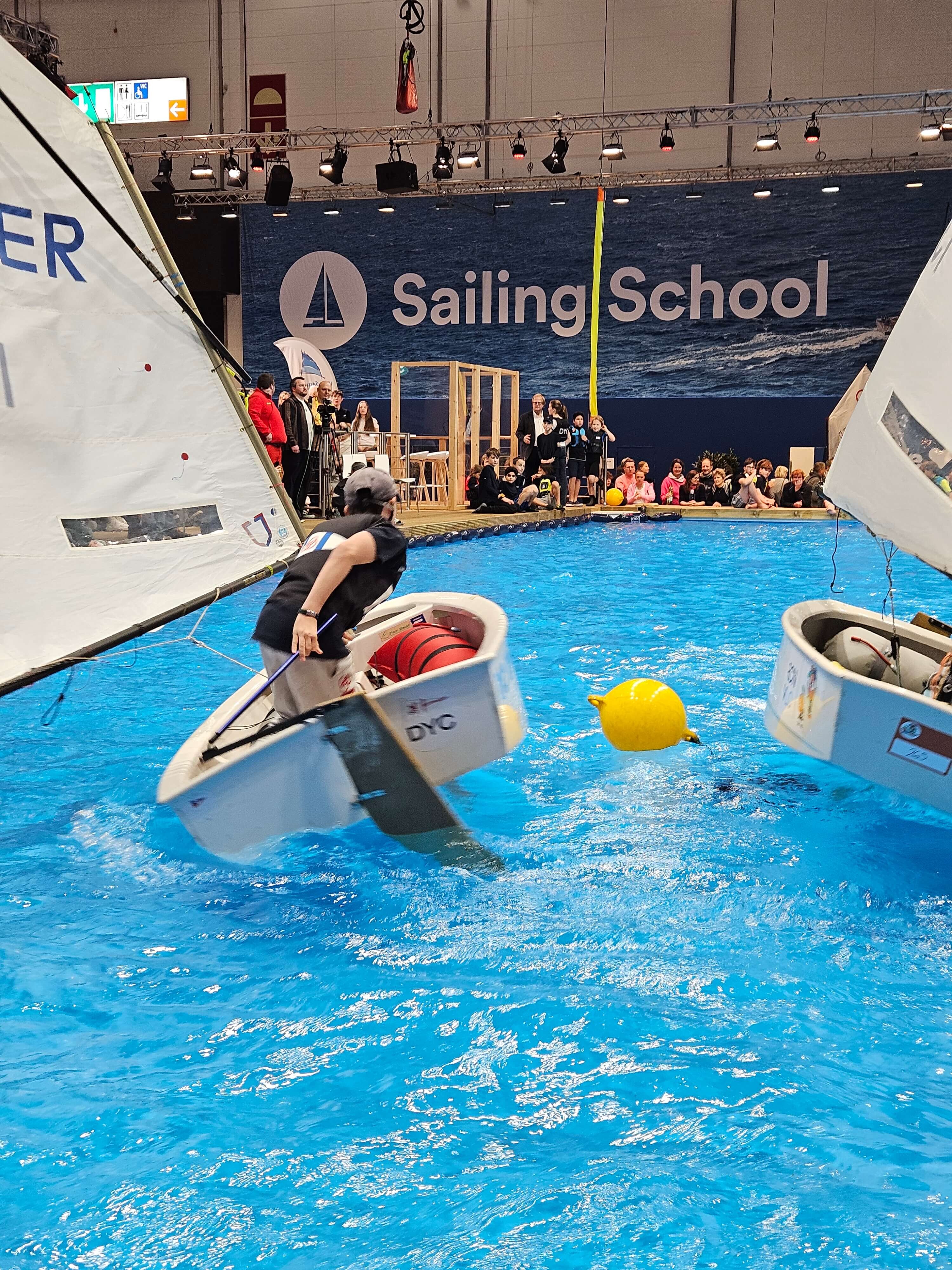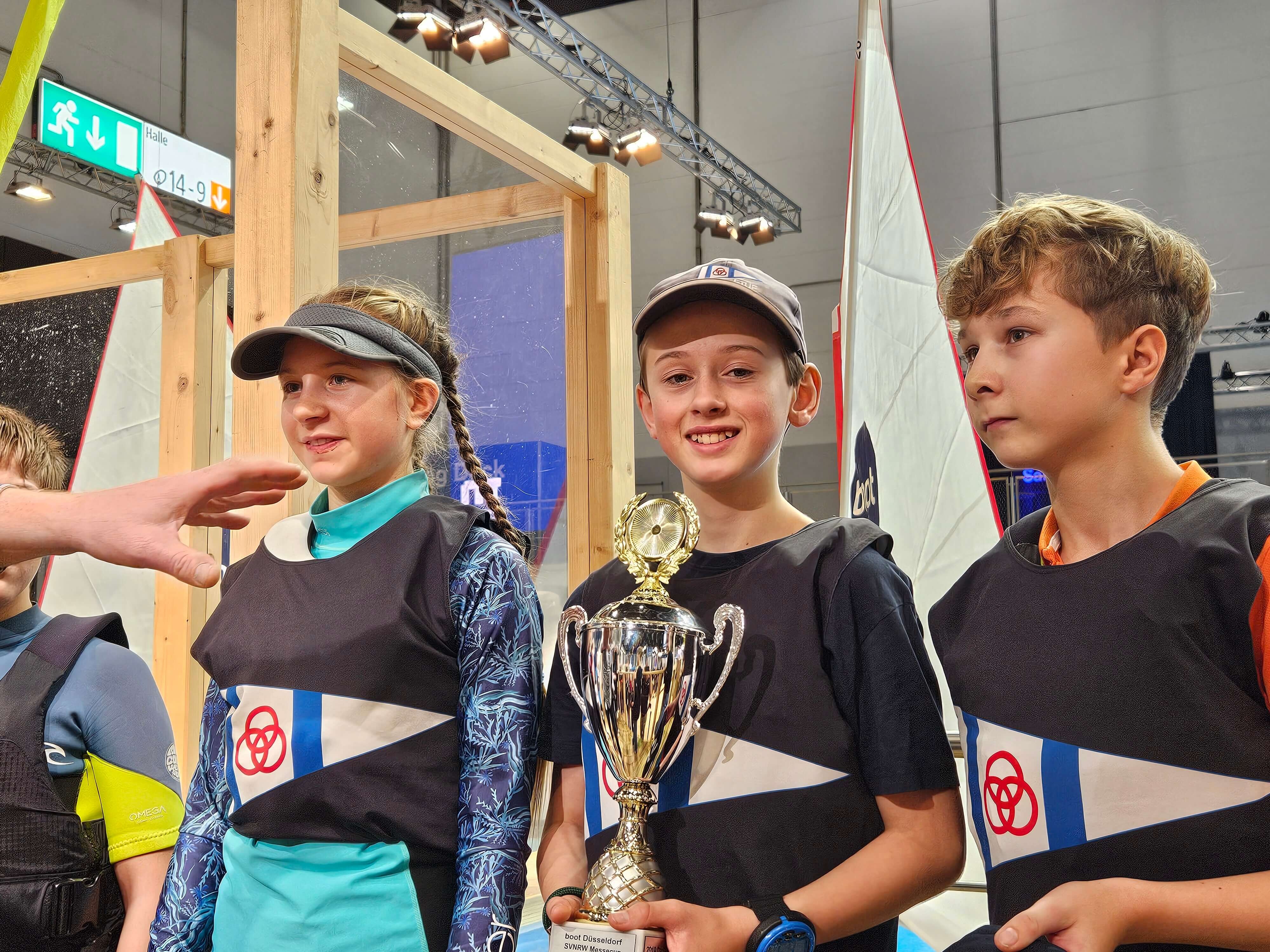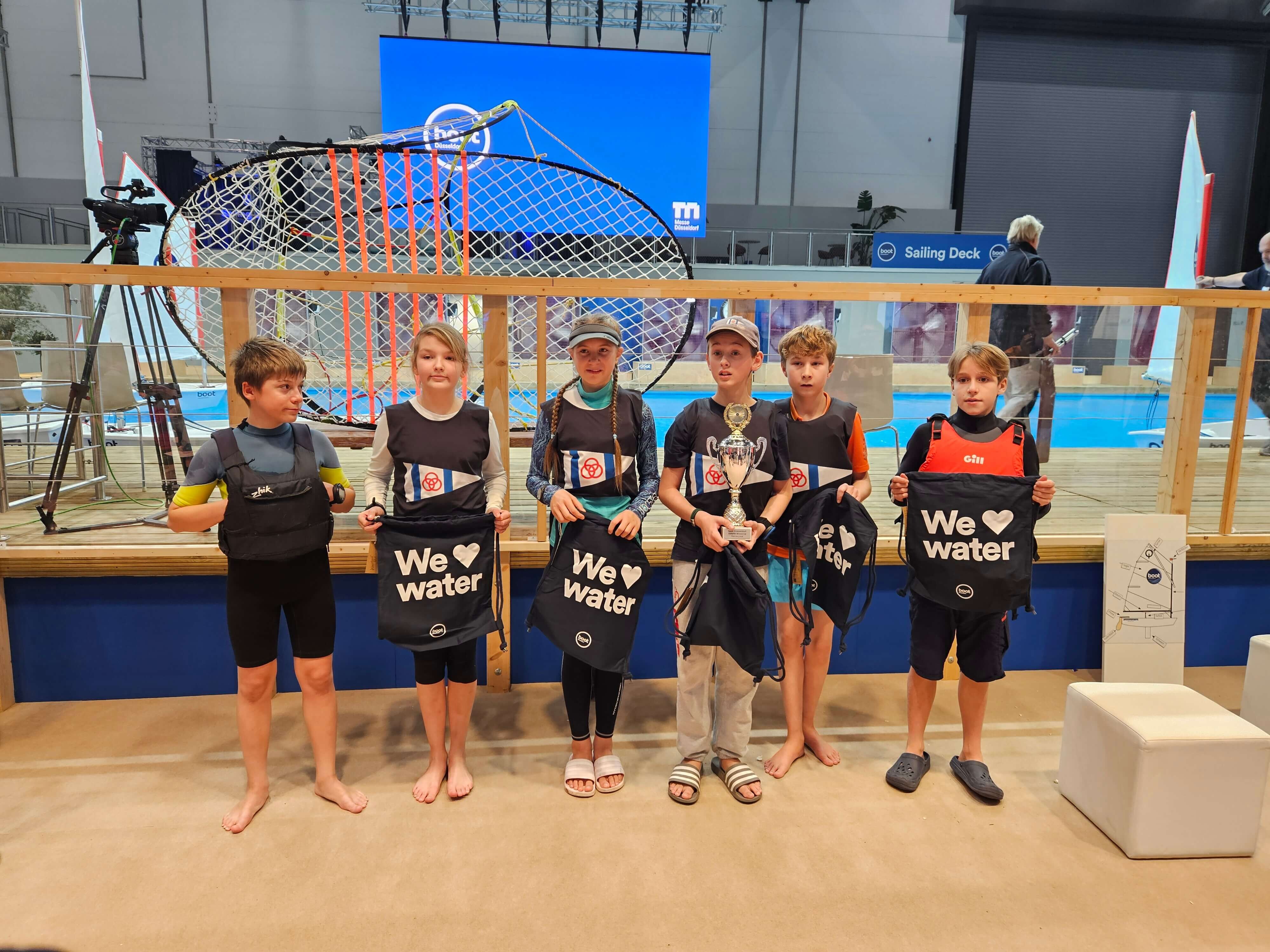 Danach wurde es besonders spannend: der Messecup, die einzige indoor Regatta Deutschlands, stand an. Hierbei treten Teams aus jeweils drei Seglern gegeneinander an, gesegelt wird in einer Qualifikations- und einer Finalserie. Wir hatten – wie einige andere Clubs auch – zwei Teams dabei: Team ETUF 1 mit Lars Rohde, Hendrik Müller und Henriette Pfeiffer und Team ETUF 2 mit Frederik Koska, Rosa Bargatzki und Johannes Gäch vom SC Ville, der für eine ausgefallene Seglerin kurzfristig eingesprungen war. Zwar ist das Becken auf der Messe nicht so groß wie ein See und der Wind kommt aus dem Ventilator, aber gerade das macht es auch besonders knifflig. Der Start ist besonders entscheidend, da es nur wenige Möglichkeiten gibt, andere Segler zu überholen. Und so zeigten unsere Segler, was sie gelernt hatten: brilliante Startmanöver und auch die Fähigkeit, ihre erkämpften Plätze an der Linie zu verteidigen. Die Rennen waren sehr spannend und letztendlich hatten es nach einer souveränen Leistung beide ETUF Teams in das Finale geschafft. Die Spannung blieb hoch: Vor dem letzten Rennen des Tages stand es auf Gleichstand zwischen dem Team ETUF 1 und dem Team vom SKBUe, alles kam nun auf diesen letzten Lauf an. Die anderen Optikinder gaben vom Rand des Beckens aus alles und feuerten unsere Teams lautstark an. Und es hat geklappt: unsere Seglerin behielt die Nerven und brachte den Sieg souverän zum ETUF. Somit war das Endergebnis Platz 1 für Team ETUF 1, Platz 2 für den SKBUe und Platz 3 für Team ETUF 2. Eine tolle Leistung von Euch allen, herzlichen Glückwunsch!