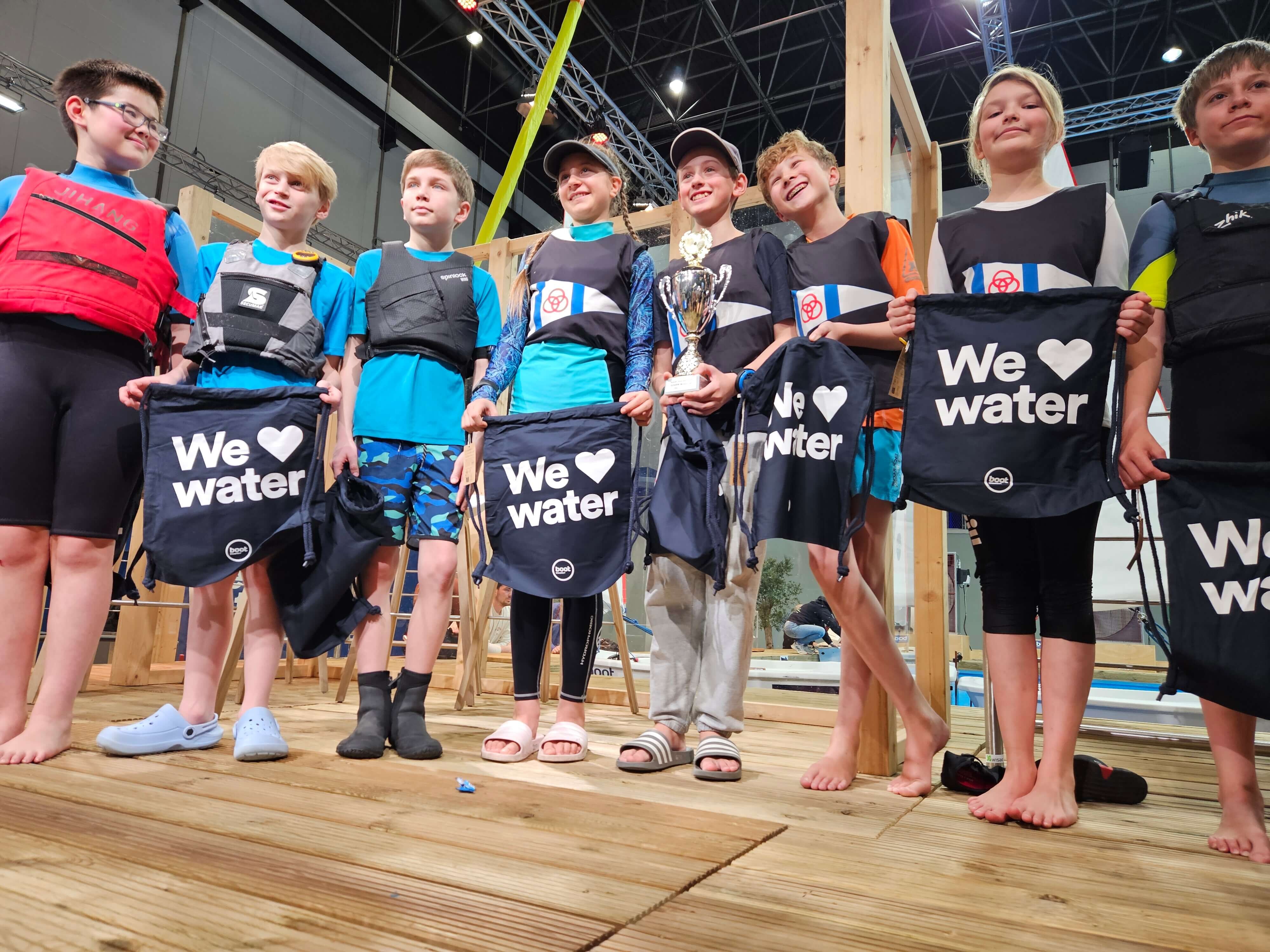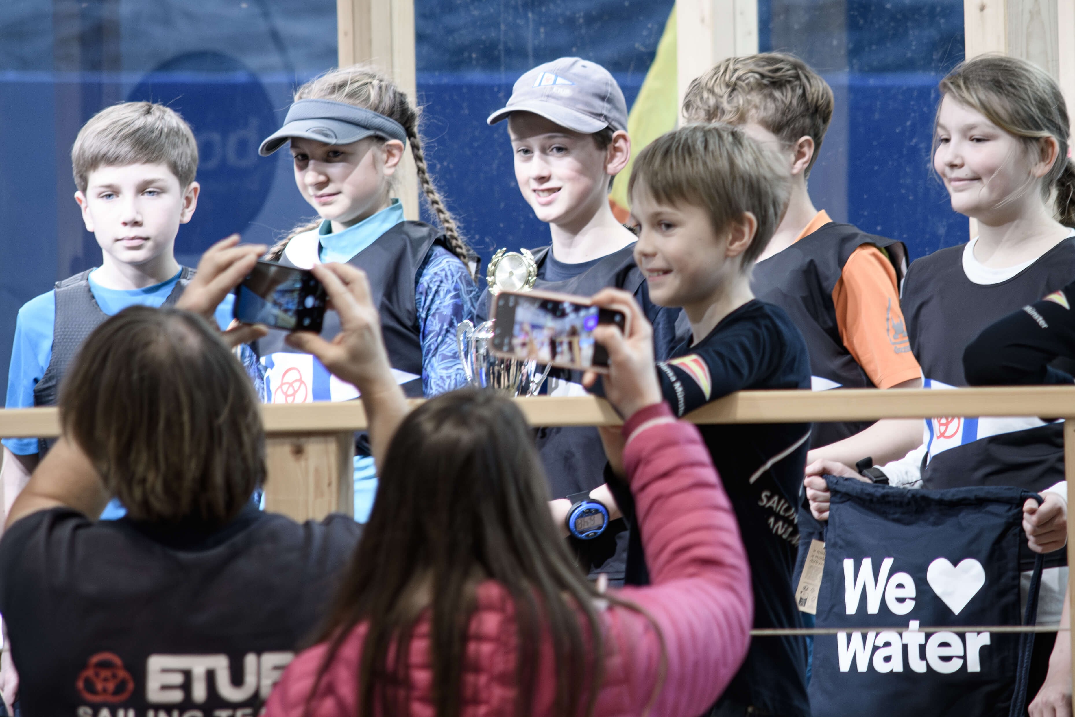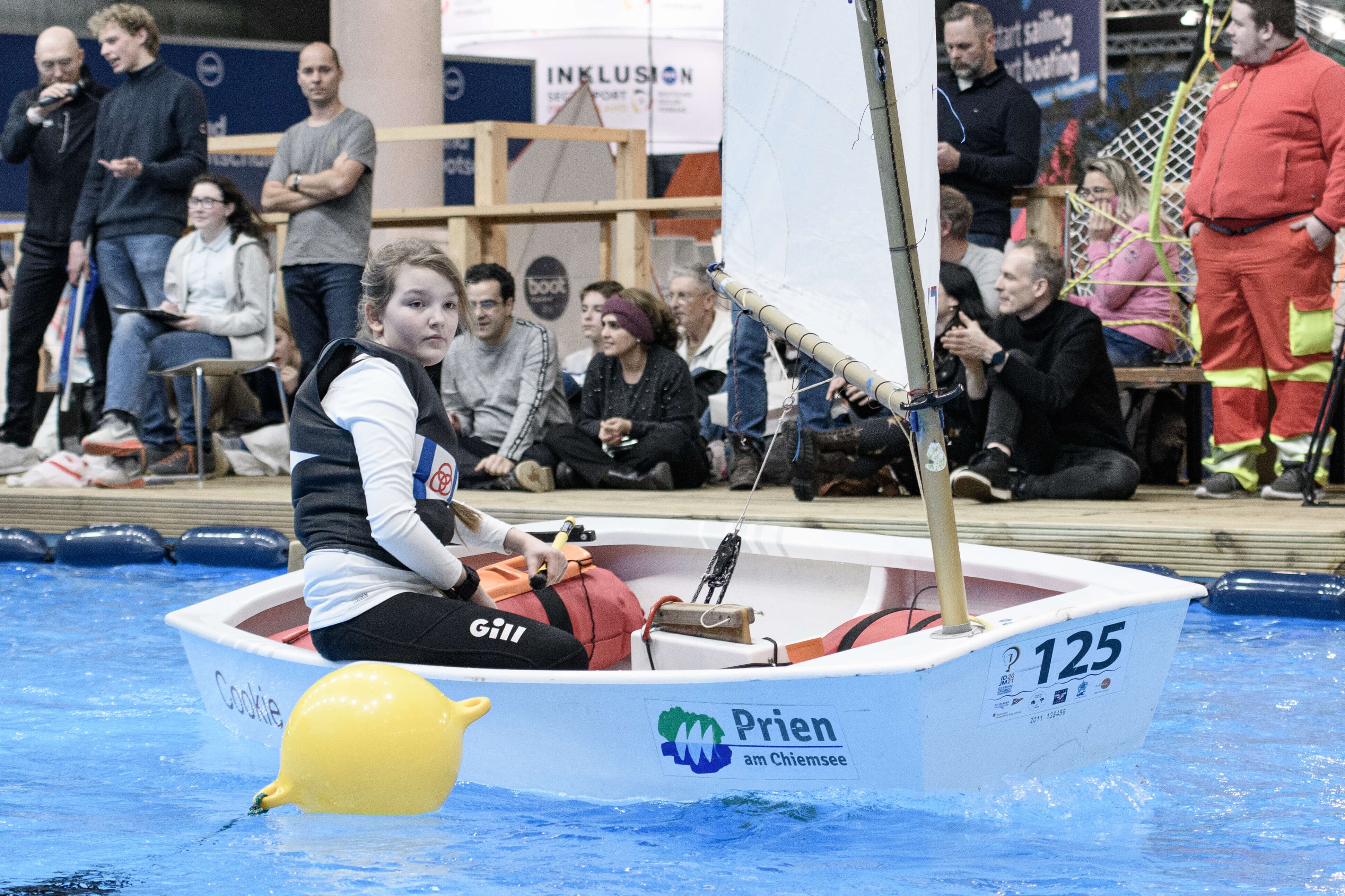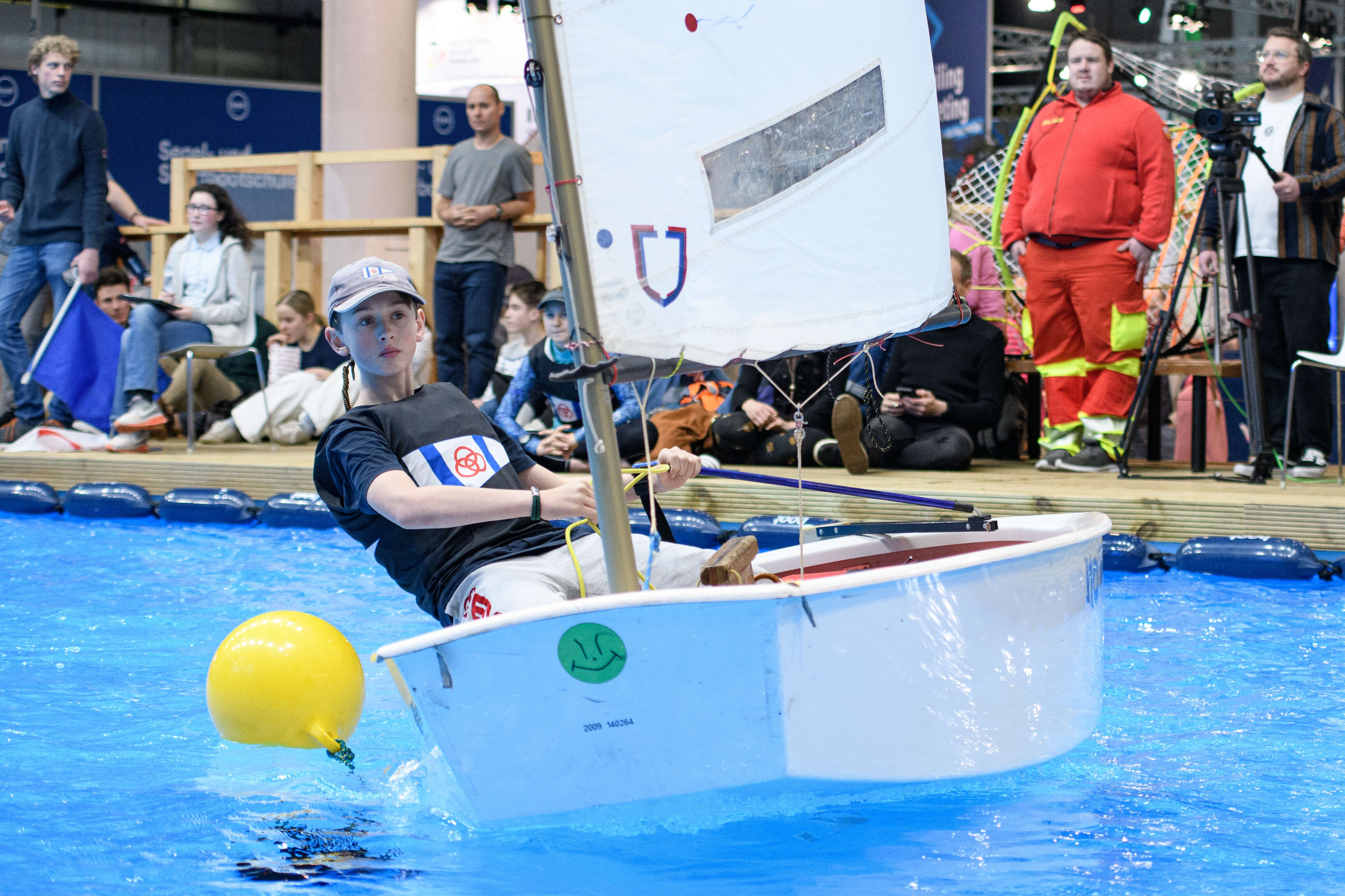 Danach wurde es besonders spannend: der Messecup, die einzige indoor Regatta Deutschlands, stand an. Hierbei treten Teams aus jeweils drei Seglern gegeneinander an, gesegelt wird in einer Qualifikations- und einer Finalserie. Wir hatten – wie einige andere Clubs auch – zwei Teams dabei: Team ETUF 1 mit Lars Rohde, Hendrik Müller und Henriette Pfeiffer und Team ETUF 2 mit Frederik Koska, Rosa Bargatzki und Johannes Gäch vom SC Ville, der für eine ausgefallene Seglerin kurzfristig eingesprungen war. Zwar ist das Becken auf der Messe nicht so groß wie ein See und der Wind kommt aus dem Ventilator, aber gerade das macht es auch besonders knifflig. Der Start ist besonders entscheidend, da es nur wenige Möglichkeiten gibt, andere Segler zu überholen. Und so zeigten unsere Segler, was sie gelernt hatten: brilliante Startmanöver und auch die Fähigkeit, ihre erkämpften Plätze an der Linie zu verteidigen. Die Rennen waren sehr spannend und letztendlich hatten es nach einer souveränen Leistung beide ETUF Teams in das Finale geschafft. Die Spannung blieb hoch: Vor dem letzten Rennen des Tages stand es auf Gleichstand zwischen dem Team ETUF 1 und dem Team vom SKBUe, alles kam nun auf diesen letzten Lauf an. Die anderen Optikinder gaben vom Rand des Beckens aus alles und feuerten unsere Teams lautstark an. Und es hat geklappt: unsere Seglerin behielt die Nerven und brachte den Sieg souverän zum ETUF. Somit war das Endergebnis Platz 1 für Team ETUF 1, Platz 2 für den SKBUe und Platz 3 für Team ETUF 2. Eine tolle Leistung von Euch allen, herzlichen Glückwunsch!