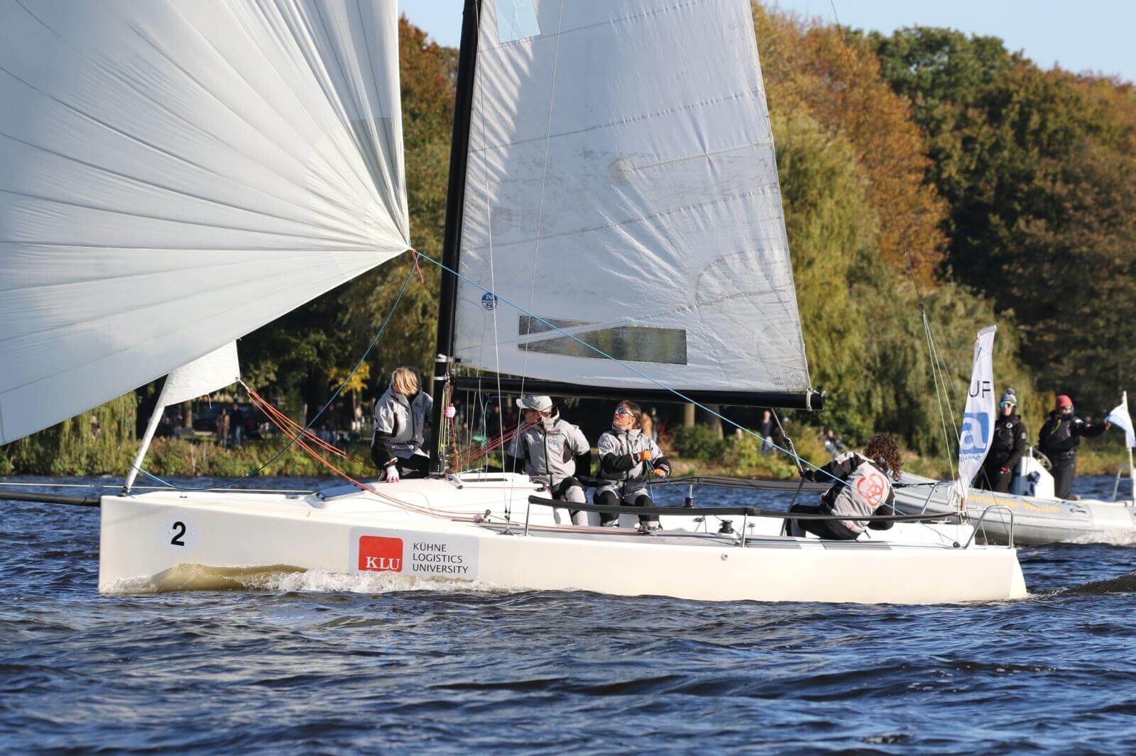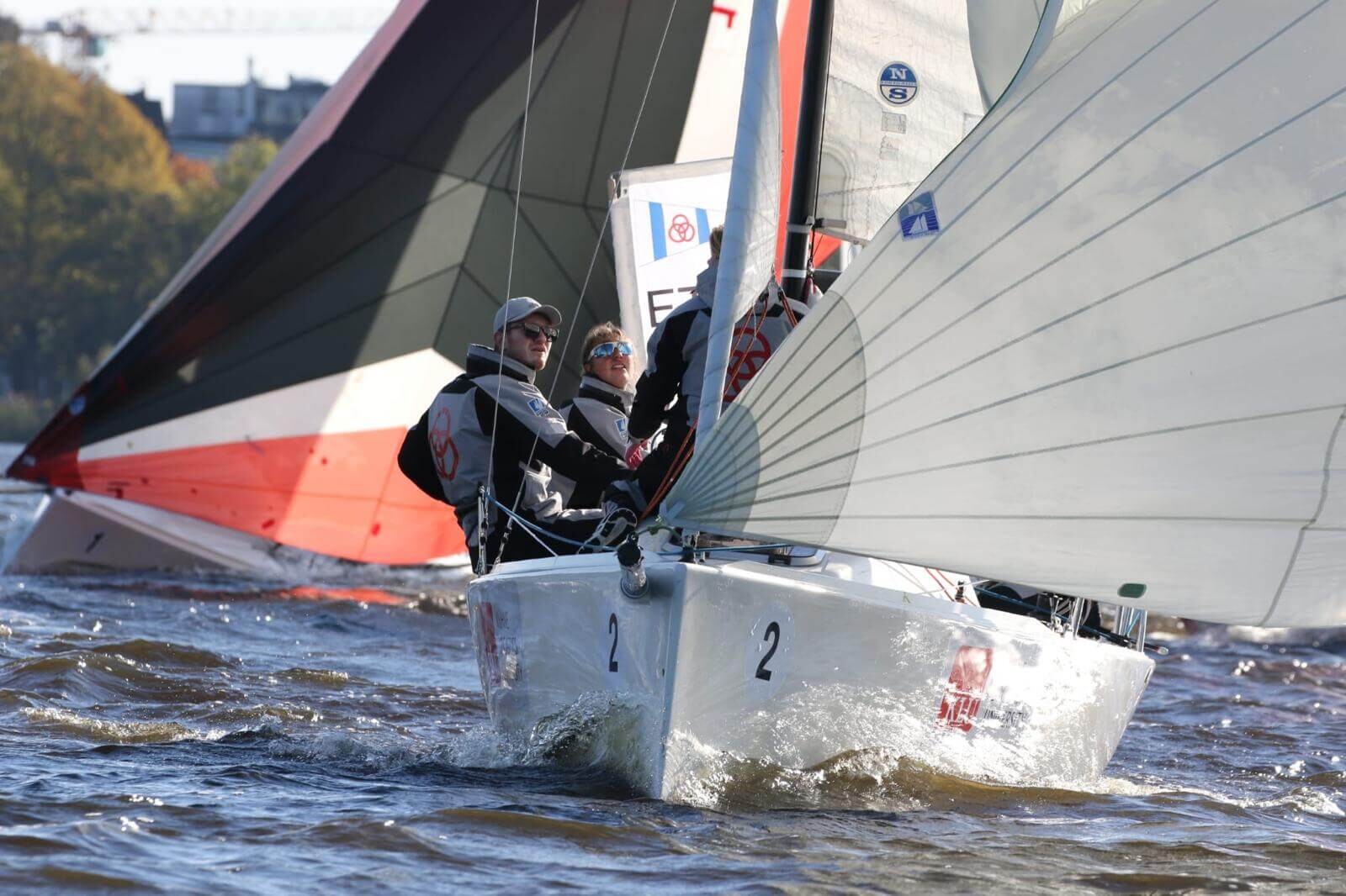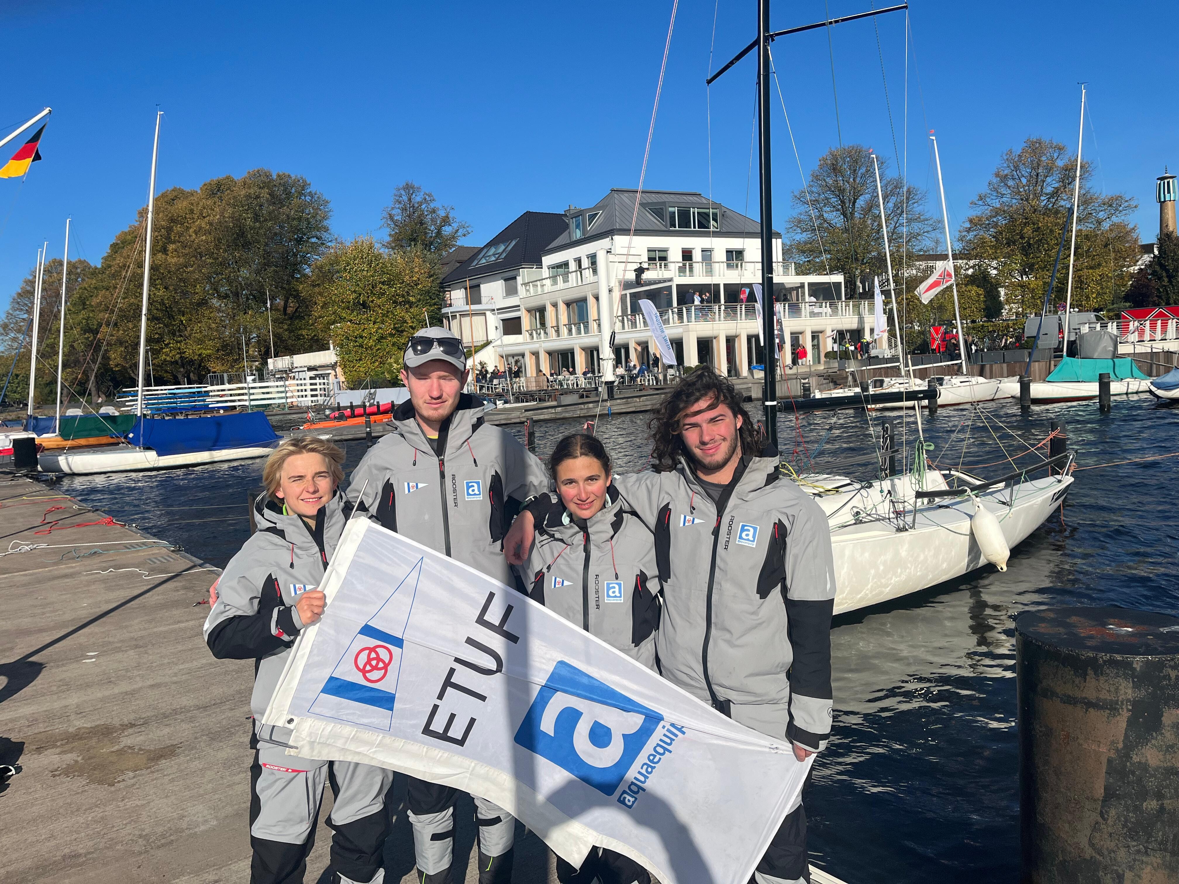 Am vergangenen Wochenende war das ETUF-Jugendliga-Team zum Saisonfinale der Deutschen Junioren Segel-Bundesliga beim Norddeutschen Regatta Verein (NRV) in Hamburg zu Gast. Gesegelt wurde auf der Alster, die mitten in der schönen Stadt Hamburg liegt und für seine drehenden, böigen Winde bekannt ist. Für den ETUF gingen Simon Klusch, Colleen Heck, Tienes Englert und Levin Kempken an den Start. Der Samstag begann mit strahlendem Sonnenschein, allerdings ohne den erhofften Wind. Nach einiger Wartezeit und viel Geduld wagte die Wettfahrtleitung am Nachmittag einen Versuch und konnte immerhin ein Rennen starten, bevor der Wind erneut einschlief. Der Tag endete schließlich an Land, wo der NRV für eine großartige Atmosphäre sorgte. Bei bestem Wetter, gutem Essen und einer kleinen Party im Clubhaus ließen die Teams den Abend gemeinsam ausklingen. Ein gelungener Tag, der trotz des fehlenden Windes für viel gute Laune sorgte. Am Sonntag drehte der Wind dann richtig auf: Bis zu 20 Knoten und die typischen, unberechenbaren Böen der Alster machten die Rennen anspruchsvoll und spannend. Dank des hervorragenden Shuttle-Services und der engagierten Wettfahrtleitung konnten sechs Flights gesegelt werden. Unser Team war dabei top ausgestattet mit der neuen Teamkleidung, die wir durch die Unterstützung unseres Sponsors AquaEquip erhalten haben – vielen Dank dafür! Auf dem Wasser entwickelte sich ein ereignisreicher Tag mit vielen spannenden Zweikämpfen und taktischen Herausforderungen. Besonders das letzte Rennen hatte es in sich: In einem packenden dreikampf beim Zieleinlauf konnten wir uns zumindest gegen eins der Teams durchsetzen und beendeten so den Tag nochmal mit einem motivierenden zweiten Platz. Insgesamt blicken wir auf ein rundum gelungenes Event zurück: super Organisation, faire Wettfahrten ohne Schäden und viele positive Eindrücke. Mit einem soliden Ergebnis im Mittelfeld schließen wir die Saison zufrieden ab, motiviert, im kommenden Jahr wieder anzugreifen